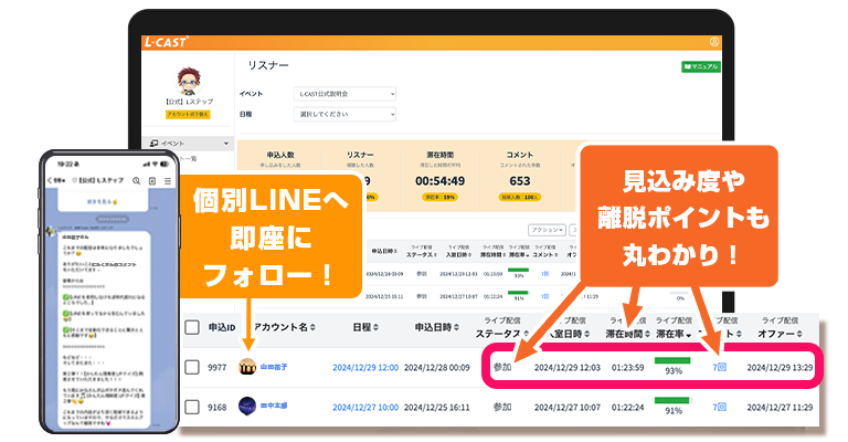 アカウント単位で視聴時間やコメントなどの行動履歴を把握し、Lステップと連携してフォローメッセージやセグメント配信をスムーズに実行できます。